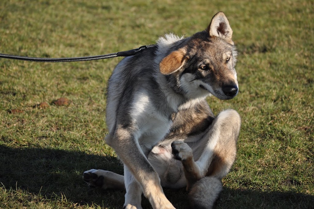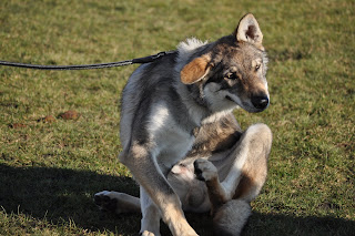 Aujourd'hui, on a fait le tour de chez eux, leur jardin est bien clôturé. Et bien à six mois, vla-ti-pas que le jeune bougre a foncé sur Fitz en aboyant, pour s'arrêter derrière le grillage grondant. Surpris, Fitz a fait un écart, puis a fait sa ronde autour, curieux. L'autre continuait à aboyer, menaçant. Puis Fitz a foncé sur vers le grillage, et le B.A. a reculé de 20m de peur. La scène s'est reproduite. C'était marrant, alors le Fitzou voulait jouer. Il avait sondé un 'jeune', et faisait fi de ses fausses menaces. Le berger était nettement plus petit, plus trapu.